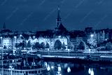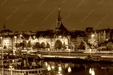 Oder River waterfront in Szczecin Poland with illuminated buildings and docked boats before sunrise