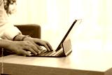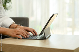 Hands of female freelancer using digital tablet with a keyboard case on wooden coffee table