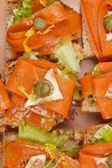 Vegan sAn assortment of open-faced sandwiches featuring carrot slices prepared as vegan salmon, arranged in a clear container