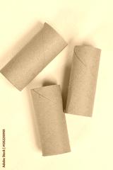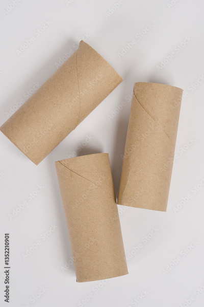 Three empty cardboard toilet paper rolls are arranged on a light gray background, shot from a birds-eye view