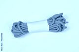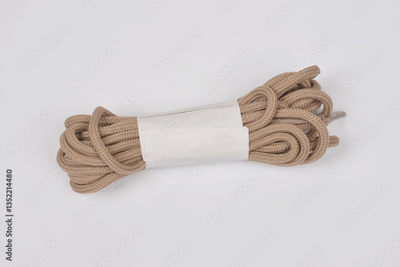 A pair of beige shoelaces are neatly coiled and bound with a white paper band, placed on a light gray background.