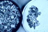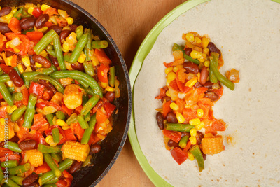 A top-down view of vegetarian enchilada preparation, with a vegetable mix in a pan and a partially filled tortilla on a plate