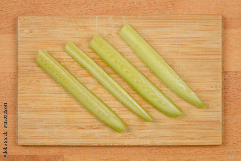 A top-down, flat-lay shot of four peeled cucumber spears arranged diagonally on a wooden cutting board