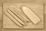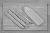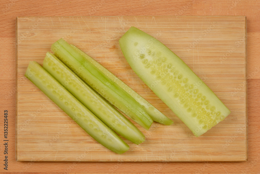 A top-down, flat-lay shot of four peeled cucumber spears and a half-peeled cucumber on a wooden cutting board