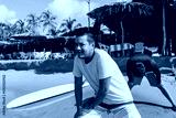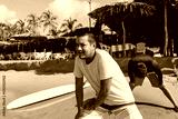 latin surf instructor and two men beginner surfers try to stand up on surfboard on lesson at beach in Acapulco Mexico Latin America, Hispanic people surfing in summer sport activity