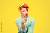 It's you! Portrait angry annoyed pin up retro style woman getting mad pointing finger at you