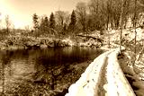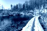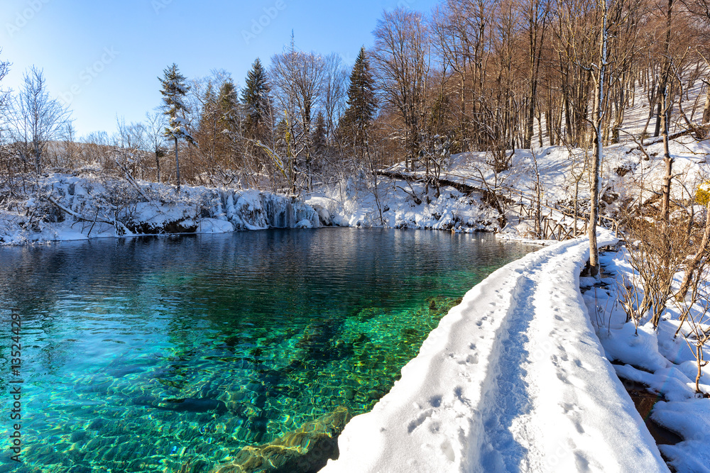 Path thru snow at plitvice lakes during winter, Croatia, Europe