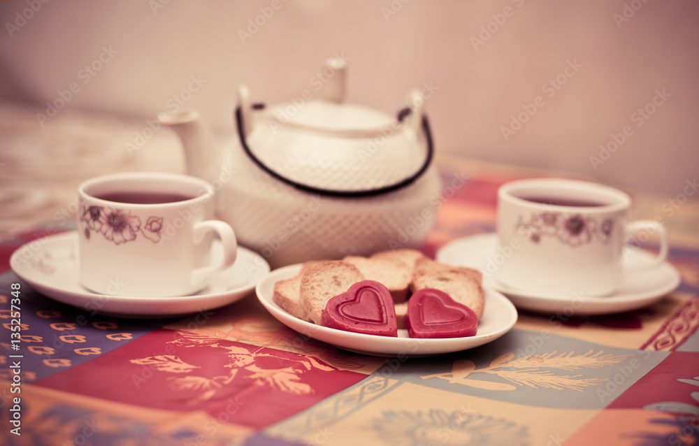 Time for a tea break. Cups of hot drink, cookies and heart shaped candies