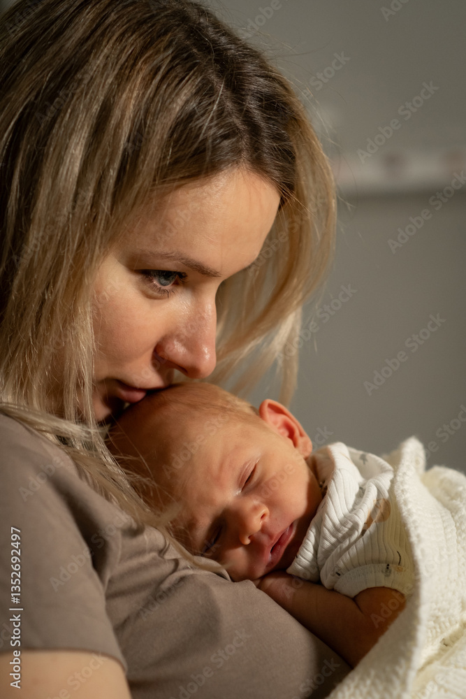 Mom lovingly cradles her sleeping baby in a cozy indoor setting during a quiet afternoon