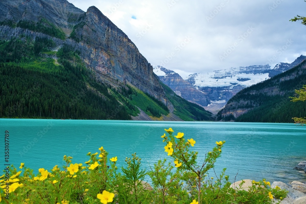 Yellow flowers in front of blue lake and the mountains