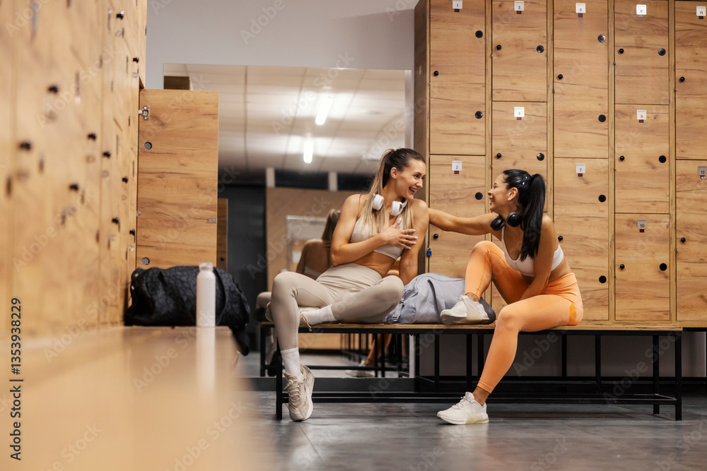 Two fit sportswomen sitting in fitting room at gym and chatting.