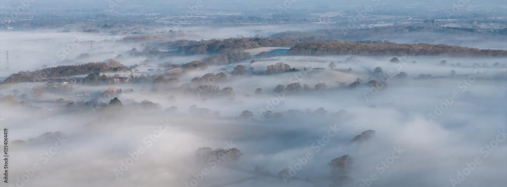 Stunning aerial drone landscape sunrise image of atmospheric cloud inversion over South Downs escarpment