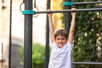 Little schoolboy, young athlete is pulling himself up on a sport horizontal bar on outdoor playground on sunny day. Active childhood, acrobat, workout on backyard, summer camp concept