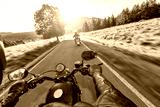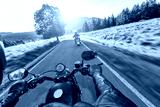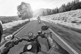 Driver riding motorcycle on an asphalt road