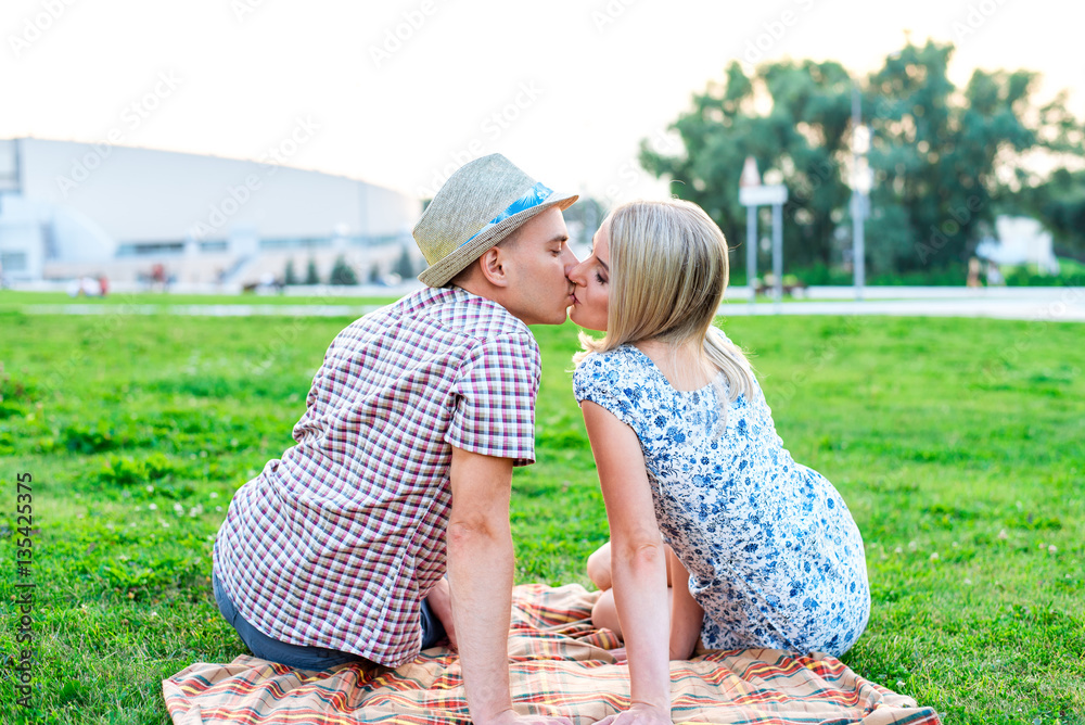 Young couple in the park sitting on the grass kissing with love concept family event, the relationship. Lifestyle in the happy romance. Outdoors summer day. Bright .
