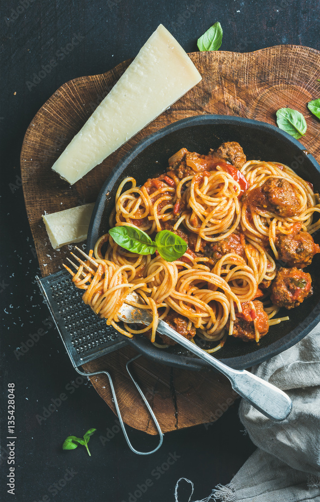 Italian pasta dinner. Spaghetti with meatballas, basil and parmesan cheese in black plate over dark rustic wood background, top view, Slow food concept