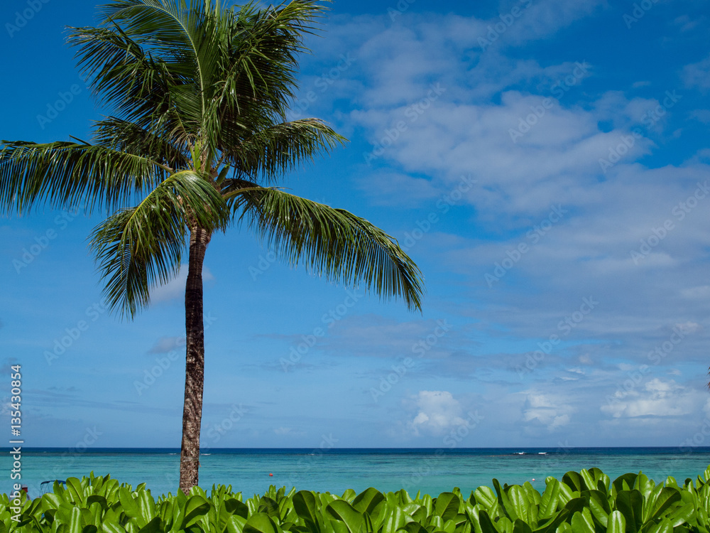A palm tree and blue ocean under the blue sky in a tropical island 南の島(グアム)の青空と海の水平線と椰子の木