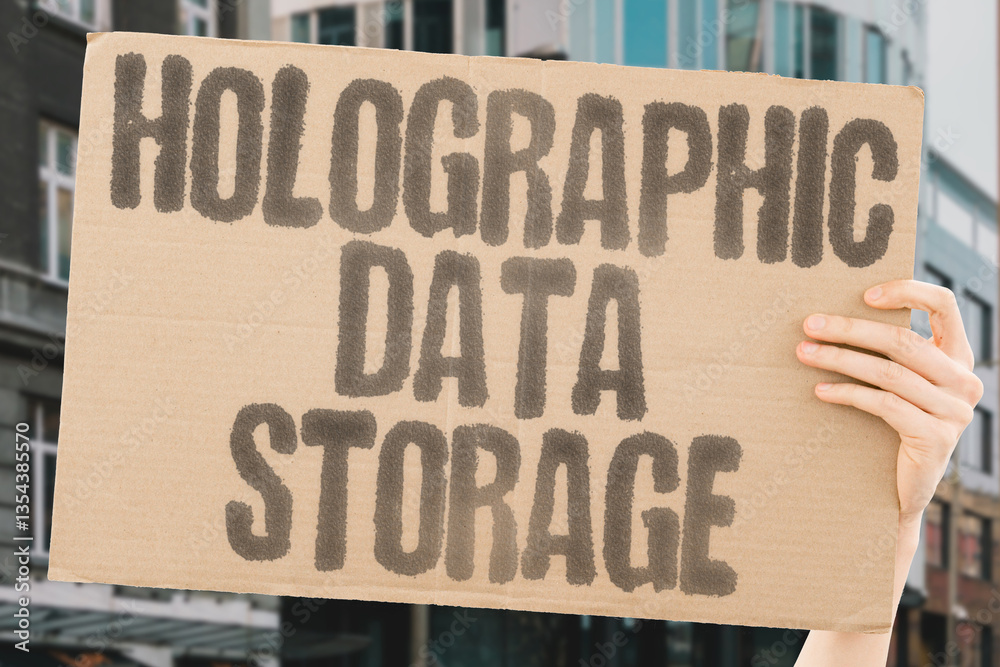 "Holographic data storage" on worn cardboard. Highlights using holograms for compact, high-capacity data storage. OPTICS. LASERS. MEDIA. RECORDING. RETRIEVAL. CAPACITY. DENSITY. VOLUME