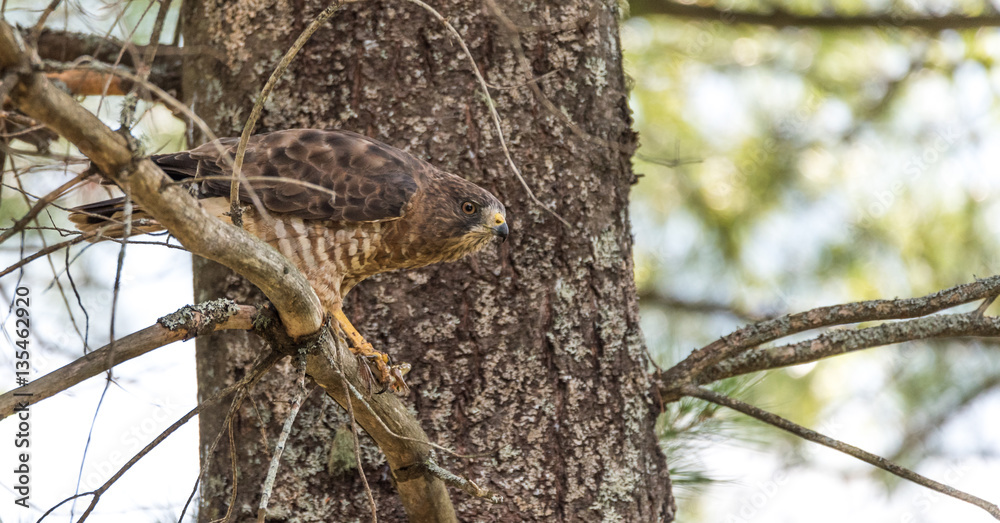 Predatory, Red-Tail Hawk. Lands on tree branch, eats a frog he caught. Dramatic and graphic depiction of predatory bird eating it's prey, tearing of flesh and natural food chain.