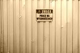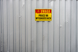 Warning sign in Polish about working at height mounted on metal wall, safety message
