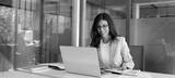 Middle age woman using laptop computer for business studying, having videocall with online virtual webinar training meeting, writing notes. Focused businesswoman working in office. Banner, copy space