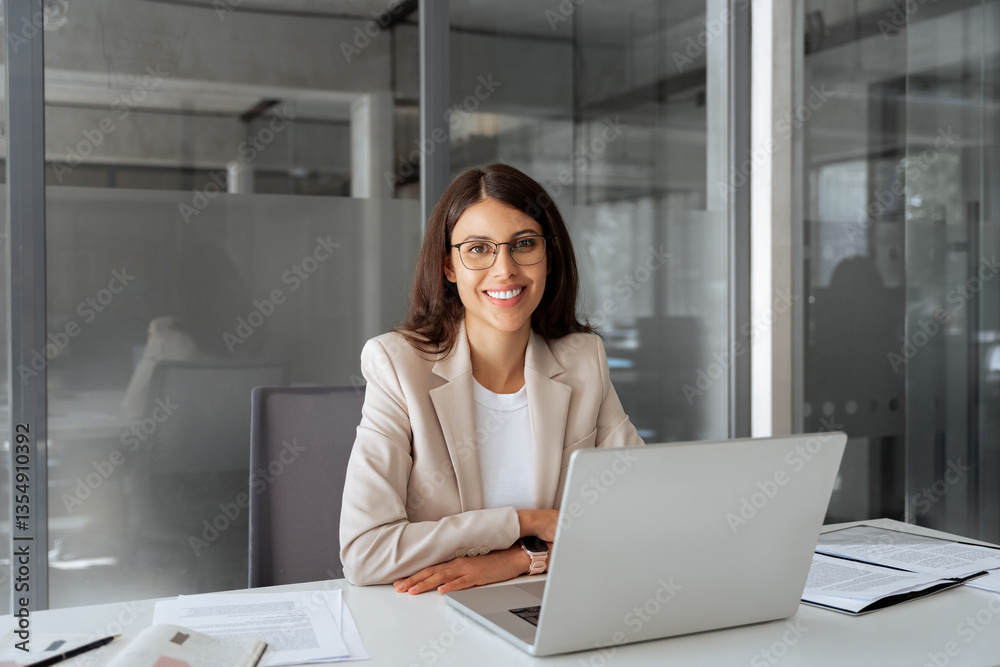 Portrait young it specialist latin hispanic business lady working on laptop pc sitting at desk in modern office smiling at camera. Middle eastern indian woman using computer technology for work online