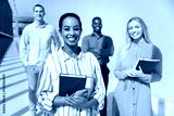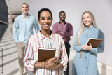 Team posing for camera led by confident professional African female leader or boss standing together in modern office hallway. Corporate staff members portrait. Career and employment, teambuilding, HR