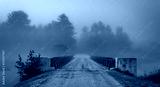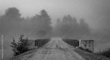 Low cloud and darkened skies. Single point perspective, surreal coloured subdued light from summer storm over a single lane, steel & timber bridge spanning a narrow passage in a lake.