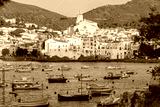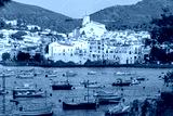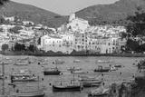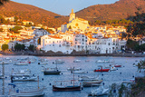 View of fishing boats in the bay of Cadaques in Catalonia, Spain with white buildings and church at sunset