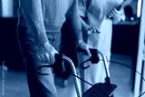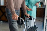 Healthcare Professional In Teal Scrubs Guiding Elderly Patient During Physical Therapy Rehabilitation Session With Walker Support