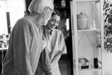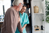 Caring Female Healthcare Professional in Turquoise Scrubs Sharing Cheerful Conversation With Elderly Male Patient During Medical Visit