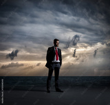 Businessman in suit and tie. Black background with copyspace. Bu