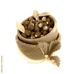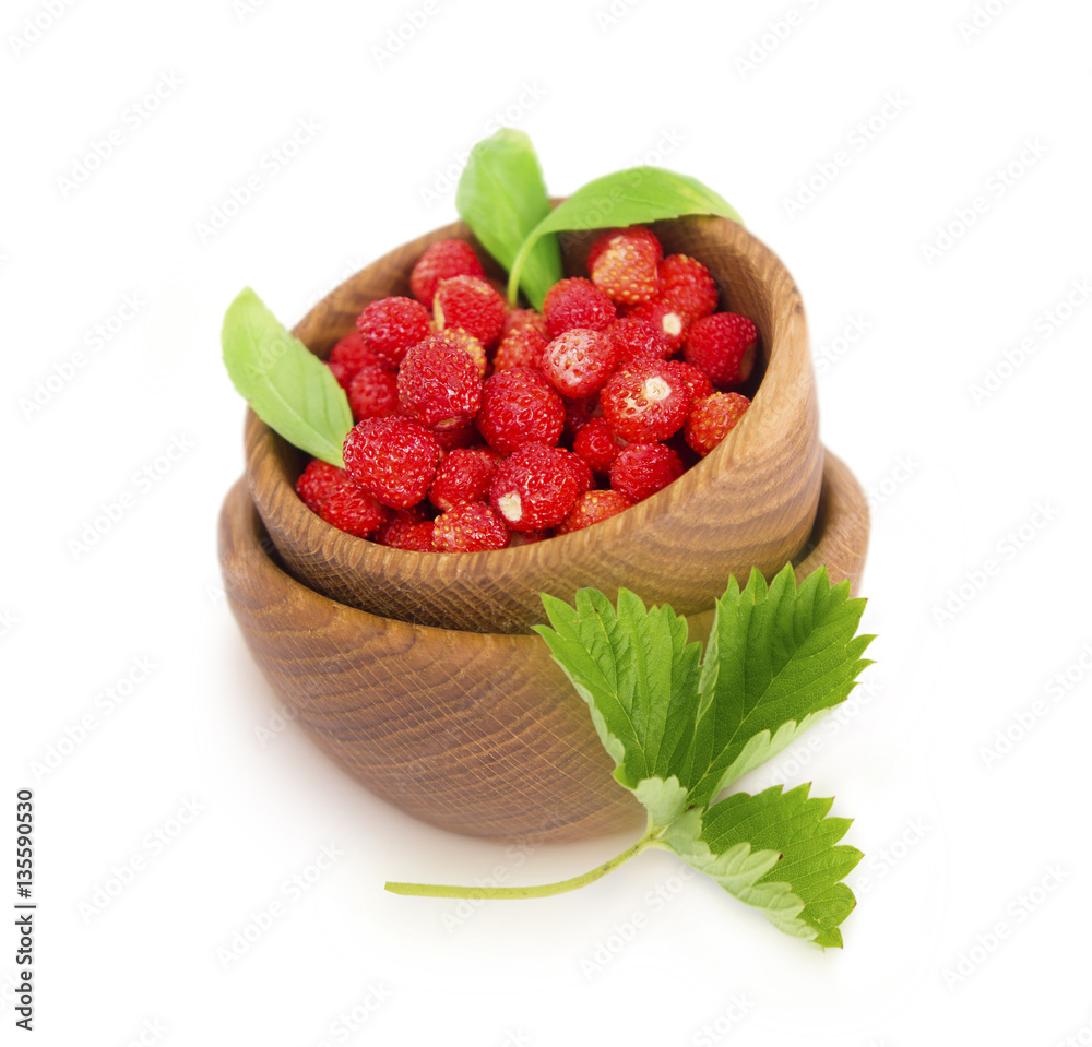 Wild small strawberries in a wooden bowl with leaves. Ripe and tasty strawberries isolated on white background. Sweet and juicy berry with copy space for text.