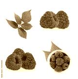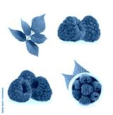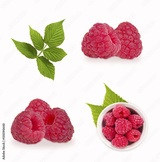 Raspberries set isolated on white background. Collage of raspberries. Raspberry close-up with leaves. Vegetarian or healthy eating. Juicy and delicious raspberries in different angles.