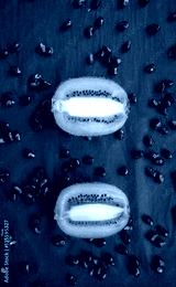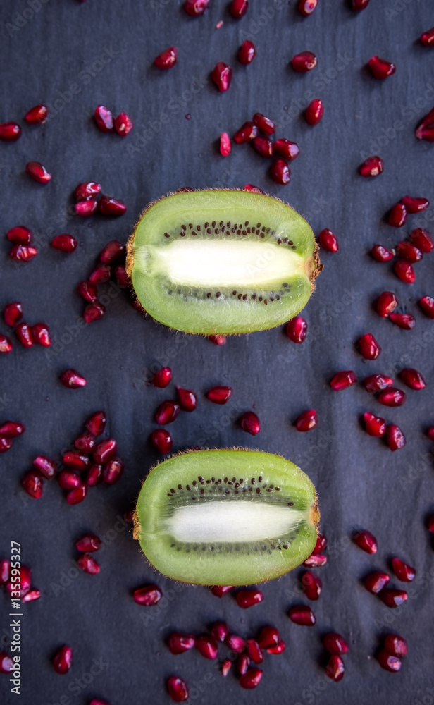 Two parallel halves kiwi and pomegranate seeds on black backgrou