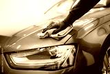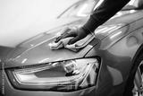 A man cleaning car with microfiber cloth, car detailing (or valeting) concept. Selective focus.