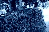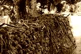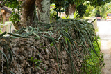 A wall of coral covered with tropical green plants outdoor at daytime on Taketomi island near ishigaki in Okinawa Prefecture in Japan with space for text.