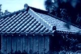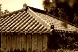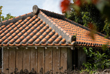the building exterior of a traditional Japanese house made of wood and with a red tiled roof outdoor at daytime on Taketomi island framed by lush greenery in Okinawa Prefecture in Japan.
