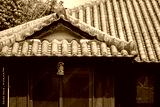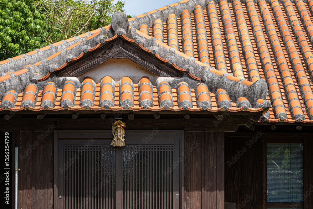 A beautiful building exterior of a traditional Japanese houses with red tiled roofs in a Ryukyu village at daytime in Taketomi island in Okinawa prefecture in Japan.