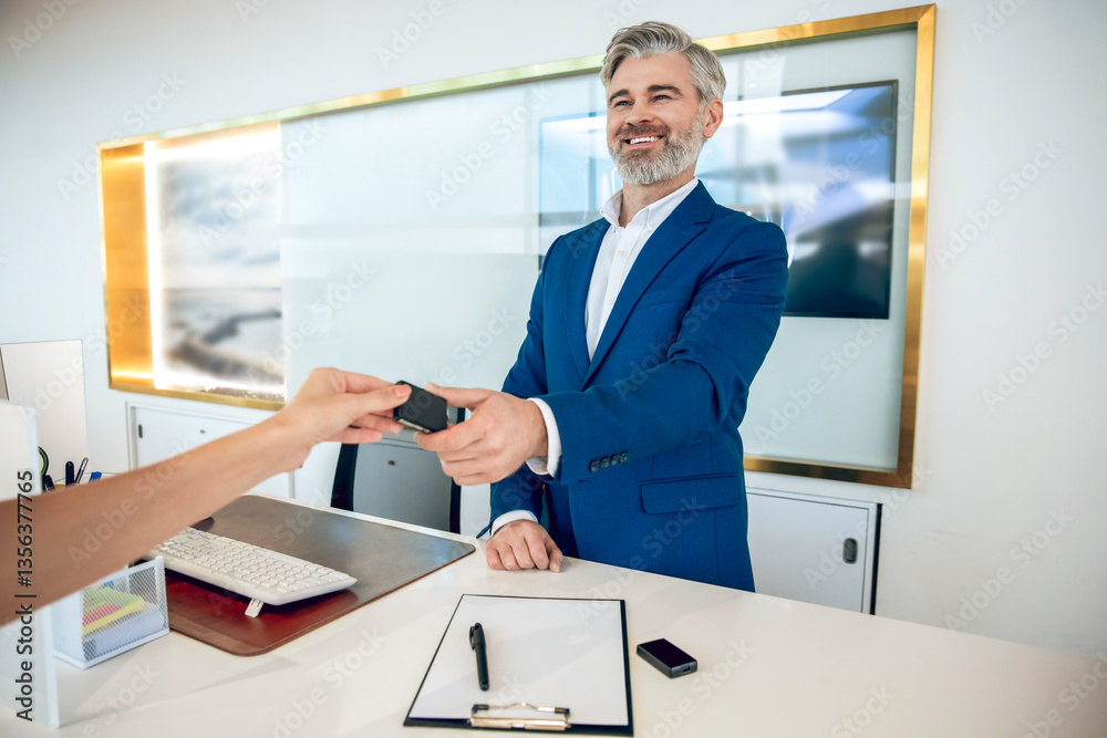 Businessperson handing keys to client after closing successful deal on car in showroom