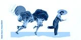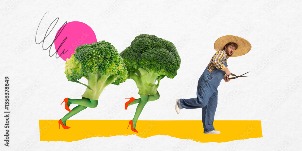 Running broccoli heads with female legs chasing gardener with scissors. Contemporary art collage. Concept of whimsical farming, vegetable harvest, gardening play, food cultivation.
