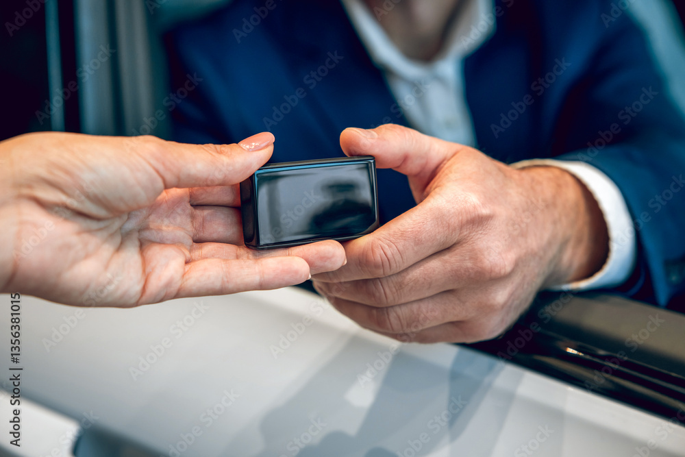 Customer accepting keys to new vehicle in showroom