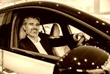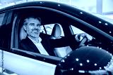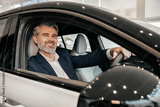 Businessman sitting in new vehicle purchasing modern car in leadership