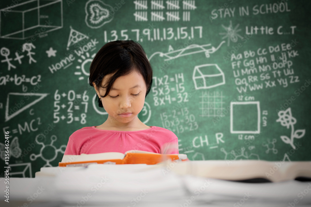 Asian schoolgirl reading a book in classroom