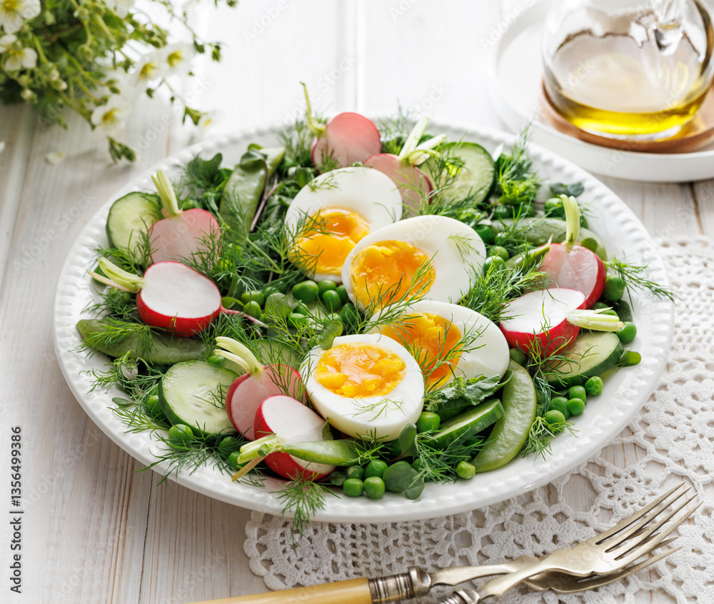 Spring salad with eggs and vegetables on a white plate, close-up. Easter food concept