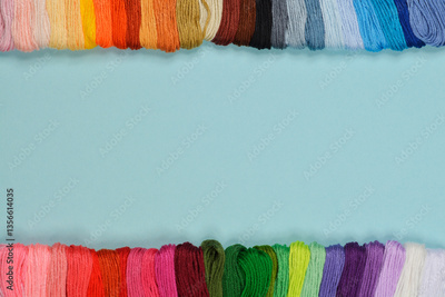 A flat-lay composition of colorful embroidery threads arranged in two parallel rows against a light blue background, creating a visually appealing frame for text or design