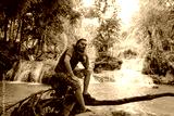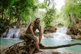 Tourist relaxing by vibrant waterfalls in Laos during a sunny day in nature