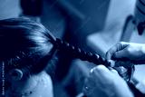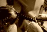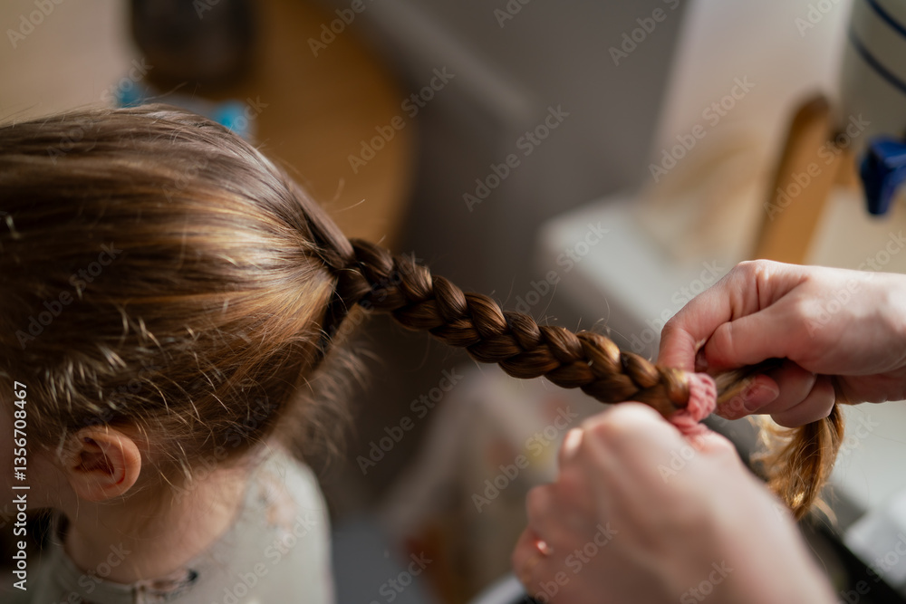 mother's hands tie her daughter's ponytail as she prepares to send her to school, morning family ritual for preparing for the day
