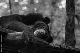 Bear resting on a wooden platform surrounded by lush green forest vegetation