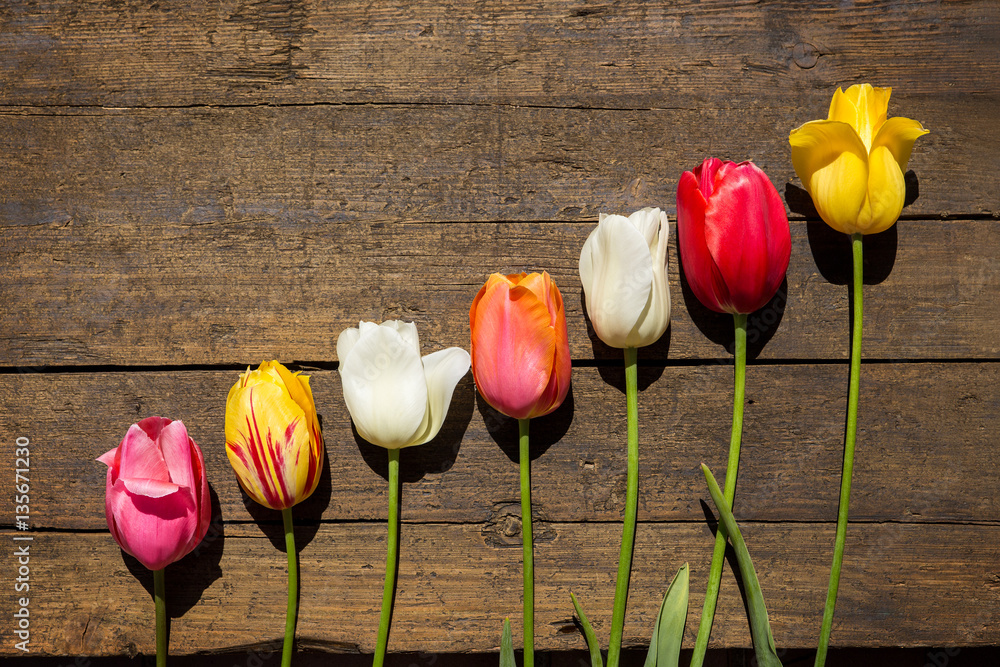 viele bunte Tulpen in einer Reihe auf altem Untergrund aus Holz